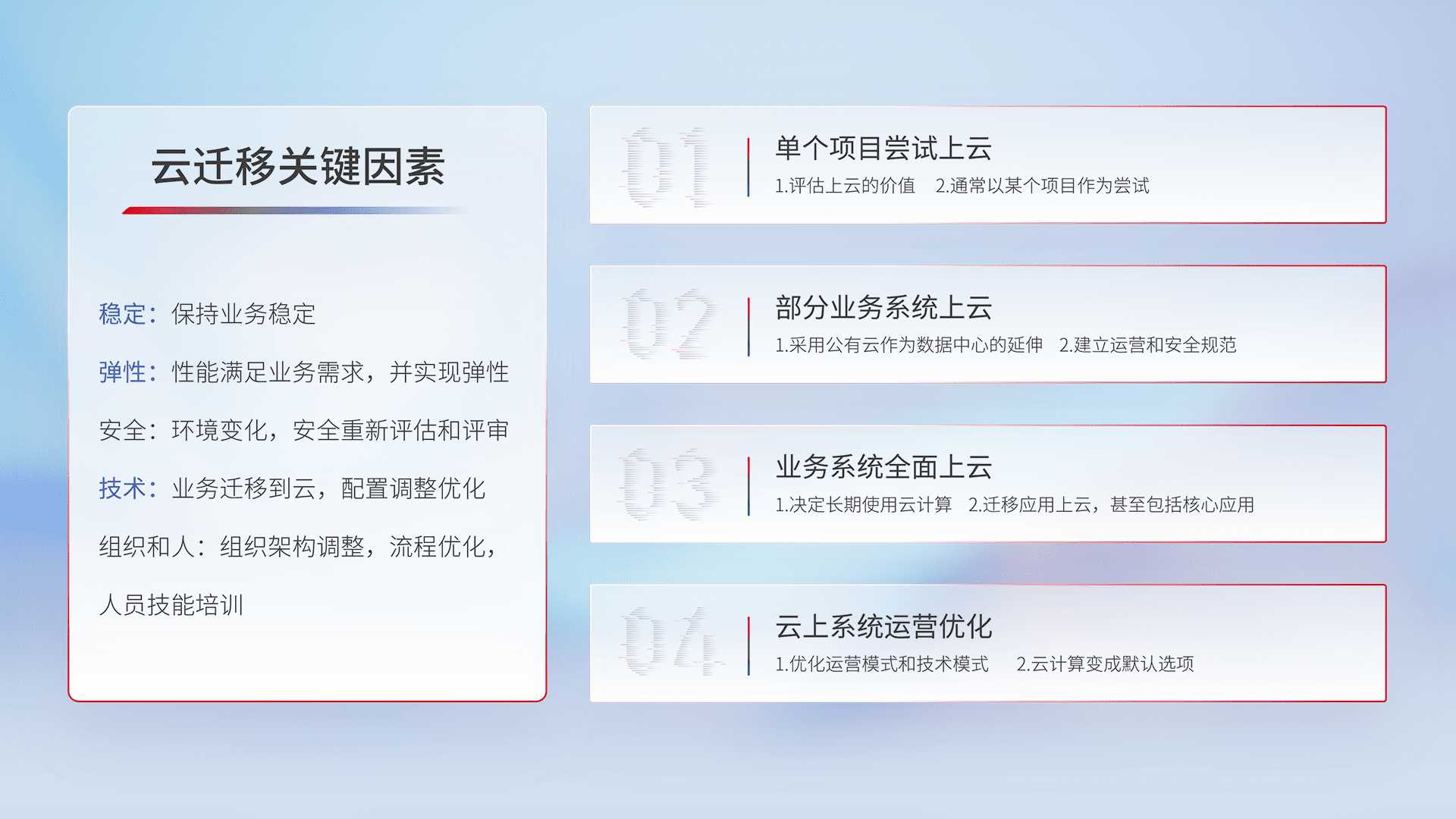 结合实际业务,,,从规划设计、、、、云平台选型、、云原生改造、、数据迁移、、、集成交付,,迁移全过程为客户识别最佳上云路径,,,,做好风险识别管理,,,设计网络架构、、身份权限、、、安全审计合规、、操作审计、、、日志审计、、、监控告警策略、、多站点容灾设计等,,,对云上基础设施进行整体规划,,,提升IT治理水平,,,以满足弹性、、高可用、、、、高性能的需求。。。