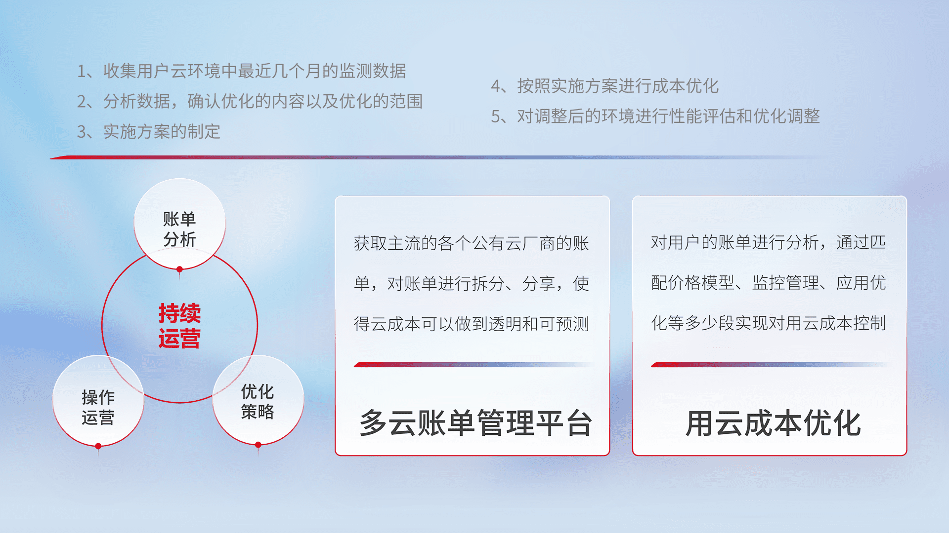 通过多云纳管,,,,以统一的资源数据模型把客户的云资源进行抽象和封装,,,,进而实现对多云资源的统一操作,,保障云资源管理的可靠性、、稳定性与可用性。。量身定制化运维内容,,,配置、、、开发运维、、、、补丁管理、、、备份、、、、监控、、、、认证和访问管理、、审计和日常巡检等,,保障在用云过程中的可靠度,,,稳定度以及高可用率。。。。